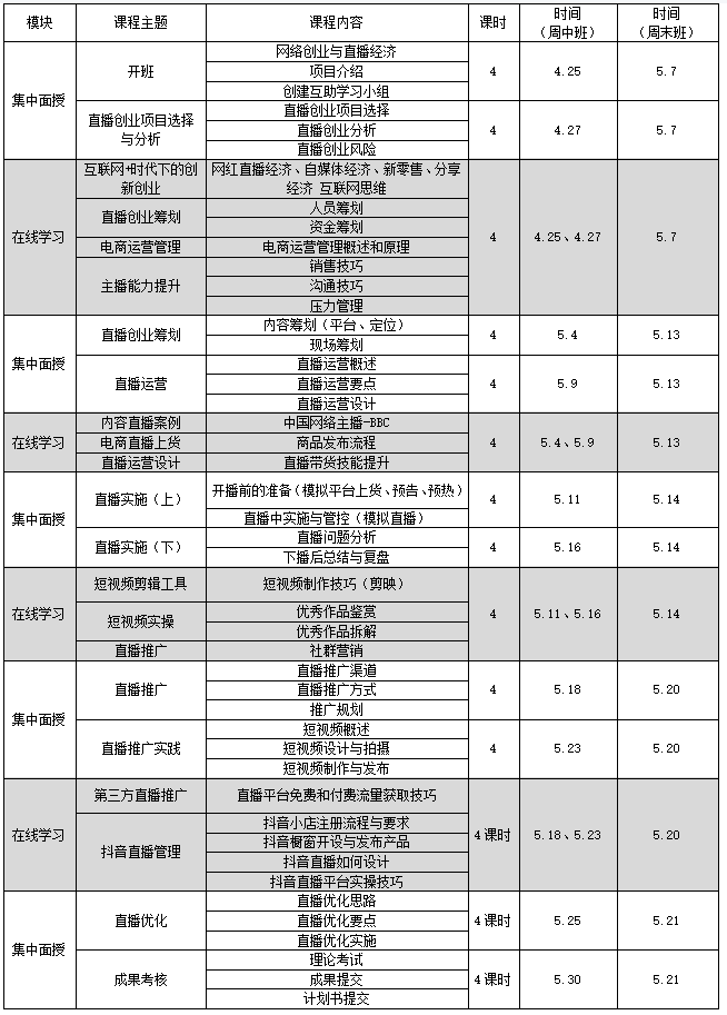 注意事项: 集中面授模块为线下课,在线学习请当晚自行安排时间。 开班后请假不得超过两次(一次课即半天,4个课时),分班名单确定后不得换班!
