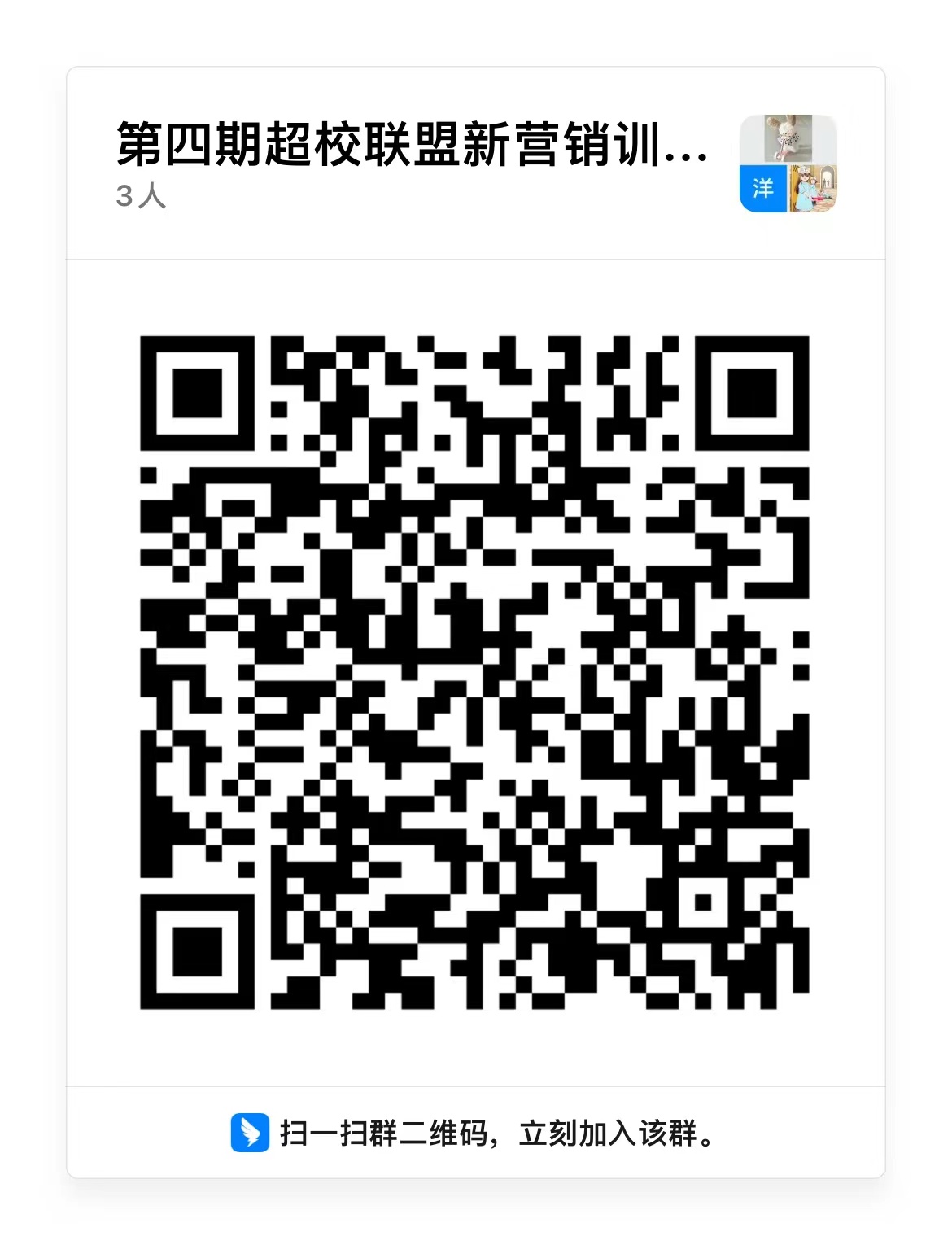 《第四期超校联盟新营销训练营负责人》钉钉群群号:10415003705。(钉钉-消息-搜索-群组)