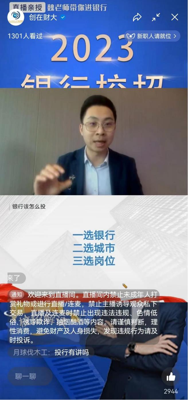 举办,绘梦蓝创空间承办的2023银行校招通关解读讲座在创在财大视频号顺利举行。为了大四应届生能够更好地应聘,激发低年级同学提前规划就业创业的积极性,a片无码